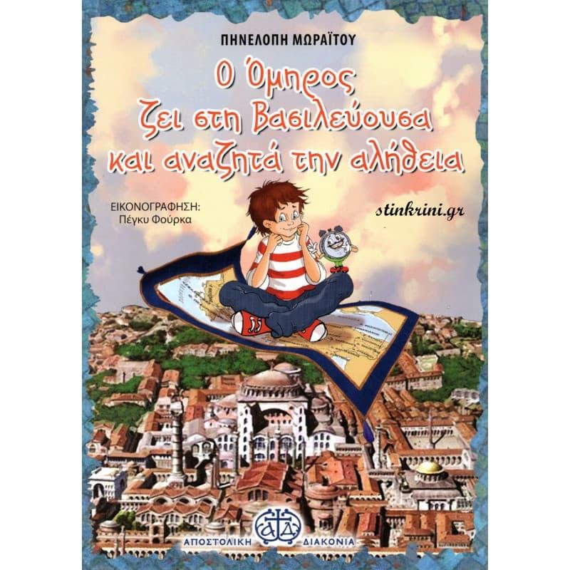 Το νέο κατηχητικό βιβλίο της σειράς "Ελληνική Ιστορία και Χριστιανική Πίστη", αποτελεί ένα οδοιπορικό του κεντρικού ήρωα της σειράς, Ομήρου, στον μαγικό κόσμο του Βυζαντίου, με κεφάλαια αφιερωμένα στους Αγίους Κωνσταντίνο και Ελένη, τους φωστήρες της Ορθοδοξίας, τους Τρεις Ιεράρχες, τον Ιουστινιανό, τον Ιερό Φώτιο, τους αποστόλους των Σλάβων Αγίους Κύριλλο και Μεθόδιο, αλλά και το Σχίσμα των Εκκλησιών, την Φραγκοκρατία και την Άλωση της Πόλεως. Το έργο εξοικειώνει τους μικρούς μας φίλους και με τα σύμβολα του Βυζαντίου, όπως τον Τίμιο Σταυρό, το Δικέφαλο Αετό, τον ναό της Αγίας Σοφίας, αλλά και το Σύμβολο της πίστεως. Ένα παιδικό βιβλίο που βοηθάει τα παιδιά να γνωρίσουν την αλληλέγγυα και άρρηκτη σχέση Εκκλησίας και Πολιτείας στο Βυζάντιο και τη συνέχεια της ιστορικής πορείας του Ελληνισμού στο πέρασμα των αιώνων. (Από τον εκδότη)