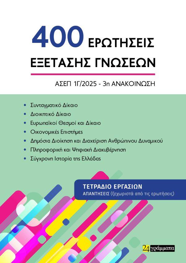 Οι 400 ΕΡΩΤΗΣΕΙΣ ΕΞΕΤΑΣΗΣ ΓΝΩΣΕΩΝ για τον ΑΣΕΠ (3η ανακοίνωση) σε έντυπη μορφή, δυνατότητα αυτενέργειας και μελέτης (ξεχωριστά οι απαντήσεις από τις ερωτήσεις). Απαντήσεις στο τέλος του βιβλίου. Περιορισμένη έκδοση για τους υποψήφιους που έχουν πρόβλημα μελέτης από την ψηφιακή έκδοση